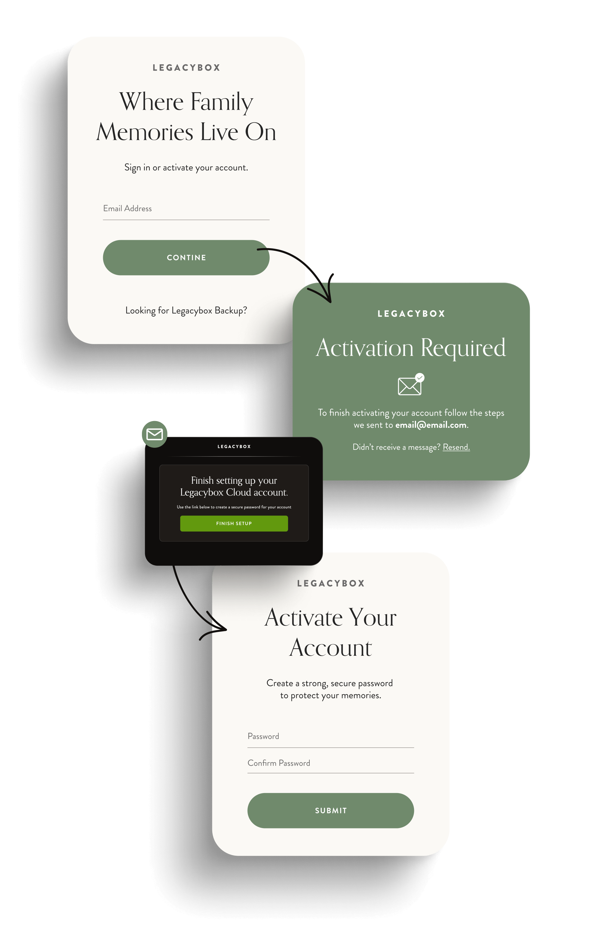 To create your Legacybox Cloud account click "activate" in the email you received or visit https://cloud.legacybox.com/ and simply enter the email address you used when placing your order. Then check your inbox. Click the link in your email and you’ll be directed to create a new password.
